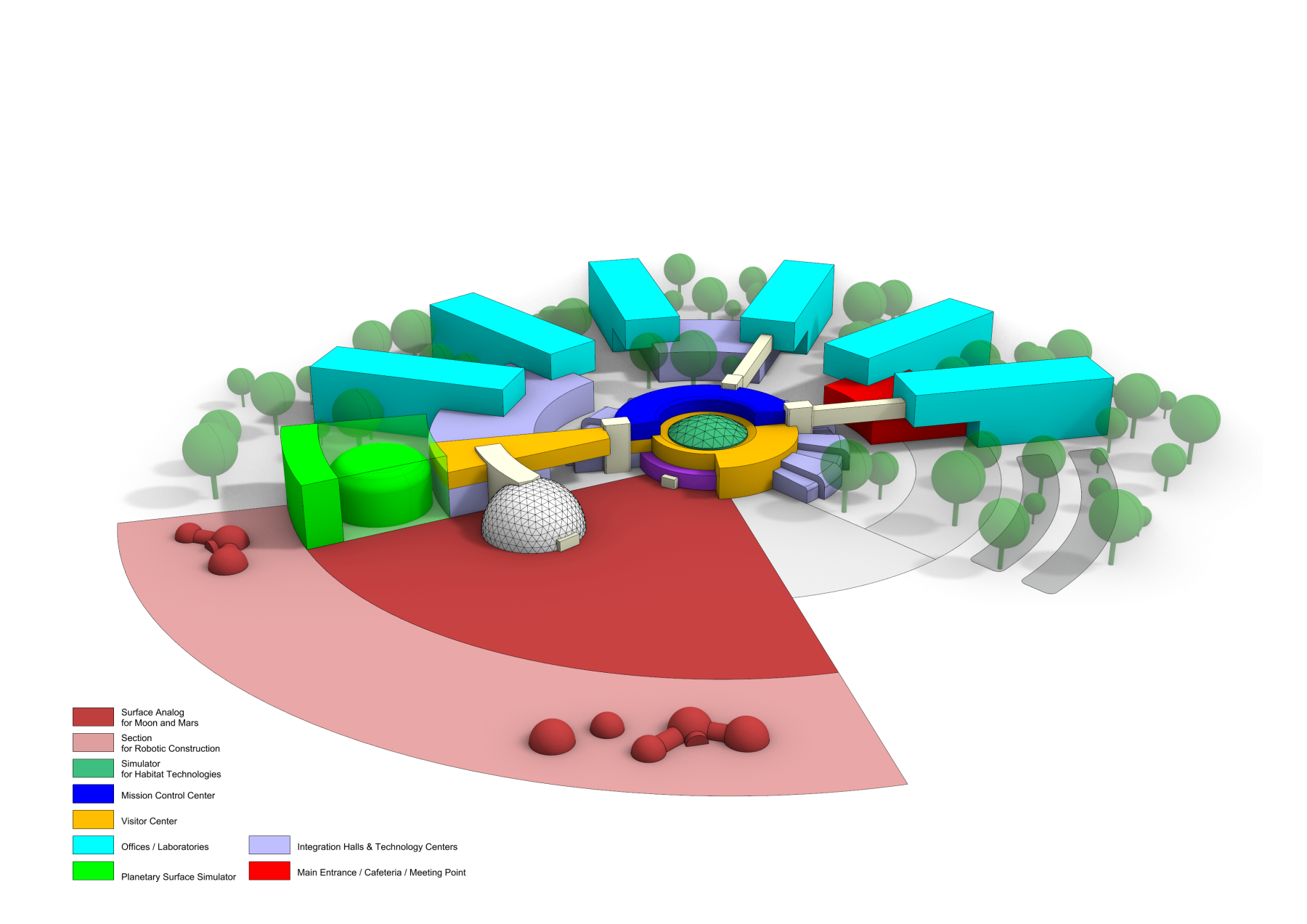 In the centre of the ERIS campus is the research building with the central infrastructure facilities as well as office and laboratory buildings for around 1,000 scientists. The compact design and the existing connections between all parts of the building promote scientific exchange across disciplines. A central mission control centre enables the monitoring and control as well as the interconnection of all test facilities, so that complex simulation missions are possible. An integrated visitor centre provides insights into the central research areas as well as memorable experiences such as virtual tours of bases on the Moon and Mars to convey awareness of the value of resources and their sustainable use.