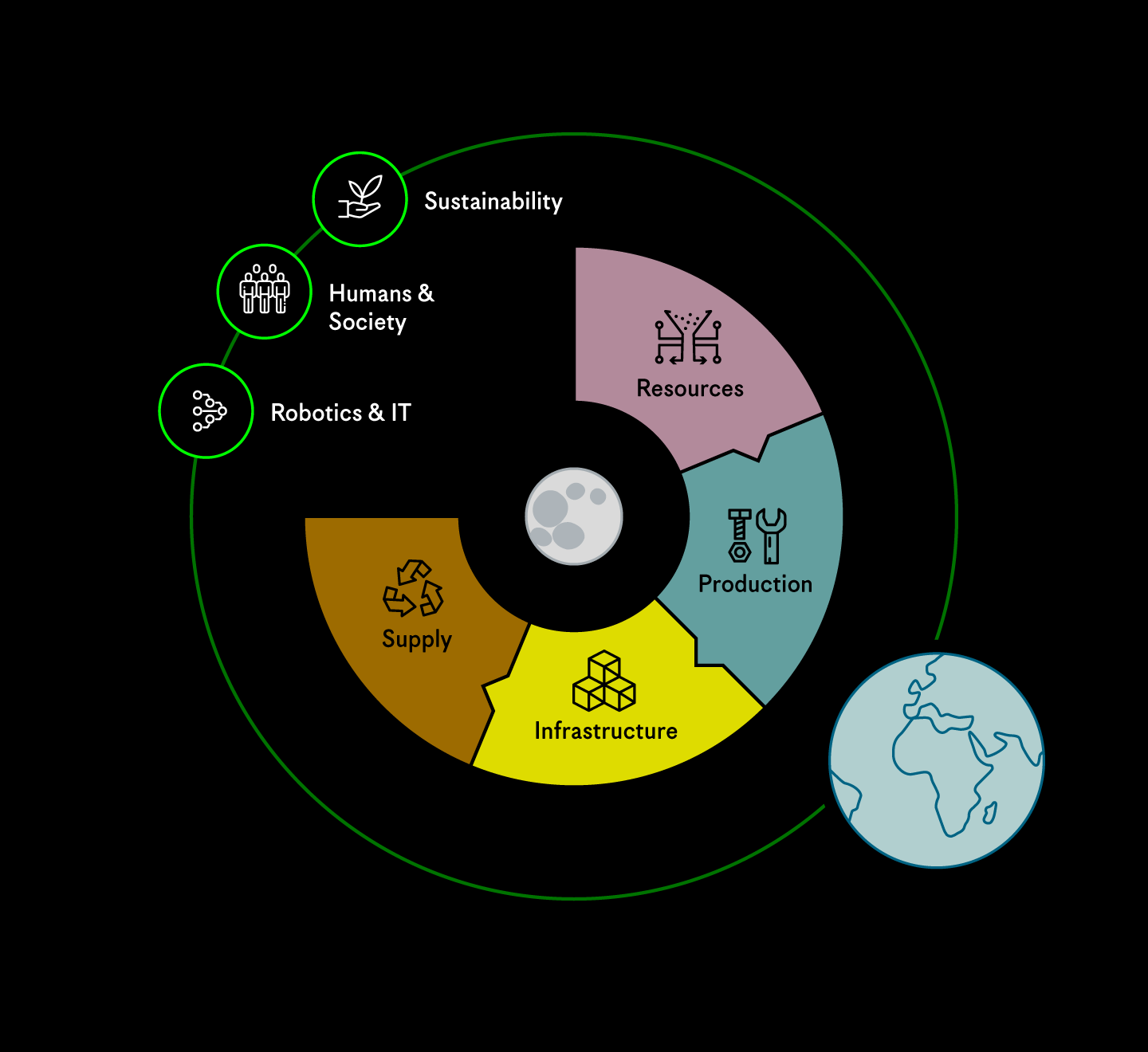 As part of the focus on habitat technologies, the infrastructure department includes in particular the habitat as a station designed for largely self-sufficient operation. This department also deals with the logistics systems that connect the habitat with the production facilities and landing platforms. Due to the extreme environmental conditions, the security infrastructure also plays a major role, taking into account protection as well as emergency systems and rescue concepts.